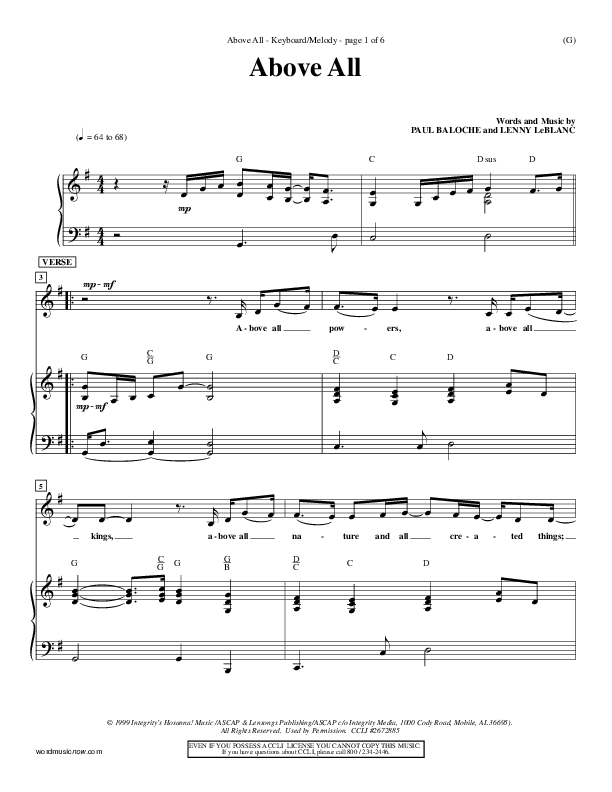Download the sheet music for Above All by Paul Baloche, from the album Word Music Now. This song was arranged by Billy Payne in the key of Ab, G.