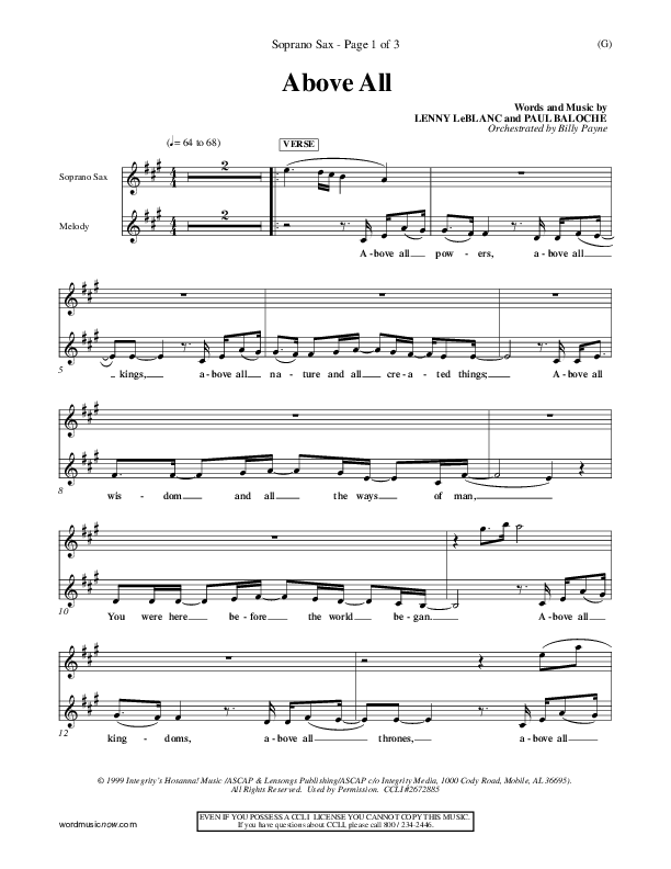Download the Orchestration for Above All by Paul Baloche, from the album Word Music Now. This song was arranged by Billy Payne in the key of Ab, G.