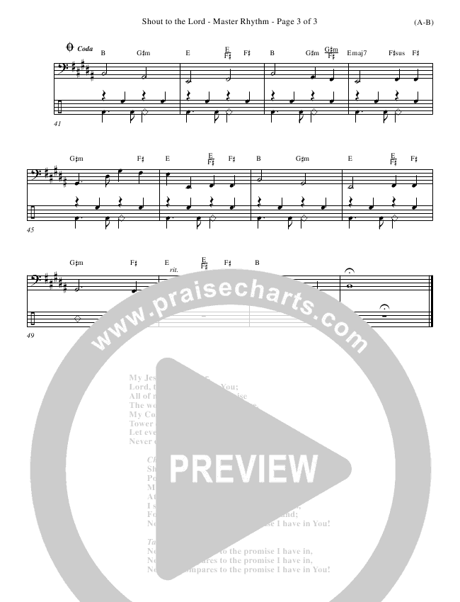 Download the Rhythm Chart for Shout To The Lord by Darlene Zschech, from the album Word Music Now. This song was arranged by Word Music in the key of A, Bb.