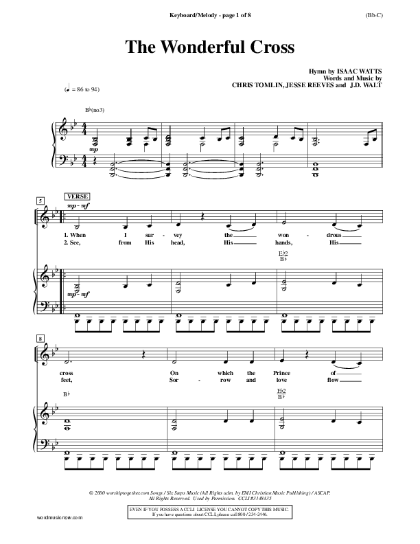 Download the sheet music for The Wonderful Cross by Chris Tomlin, from the album Word Music Now.