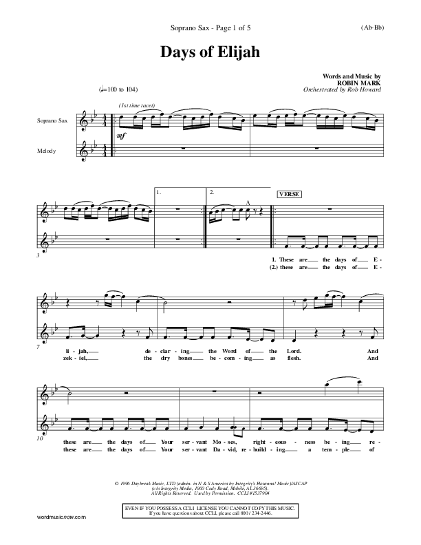 Download the Orchestration for Days of Elijah by Robin Mark, from the album Word Music Now. This song was arranged by Rob Howard in the key of A, Ab.