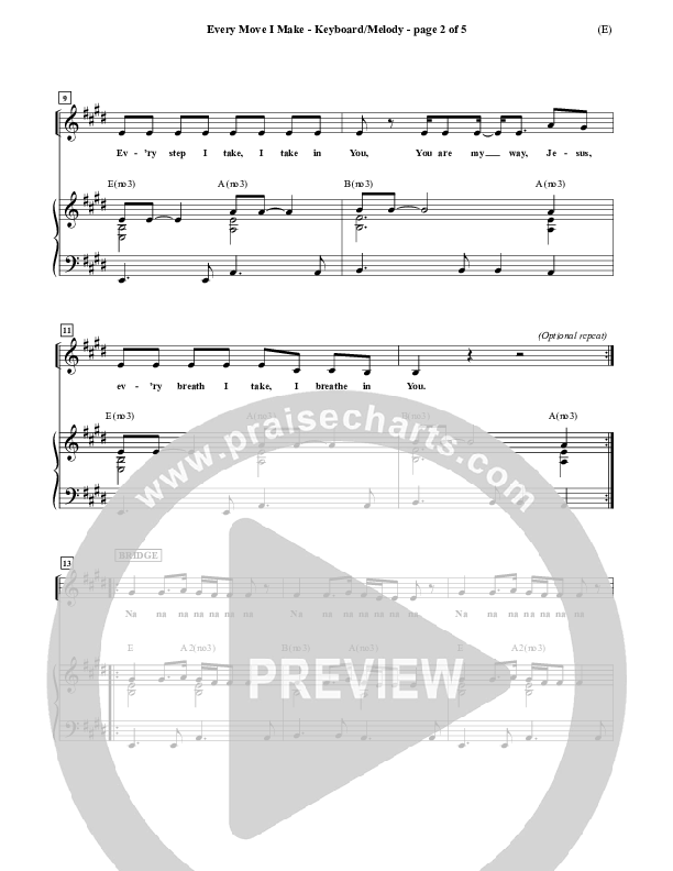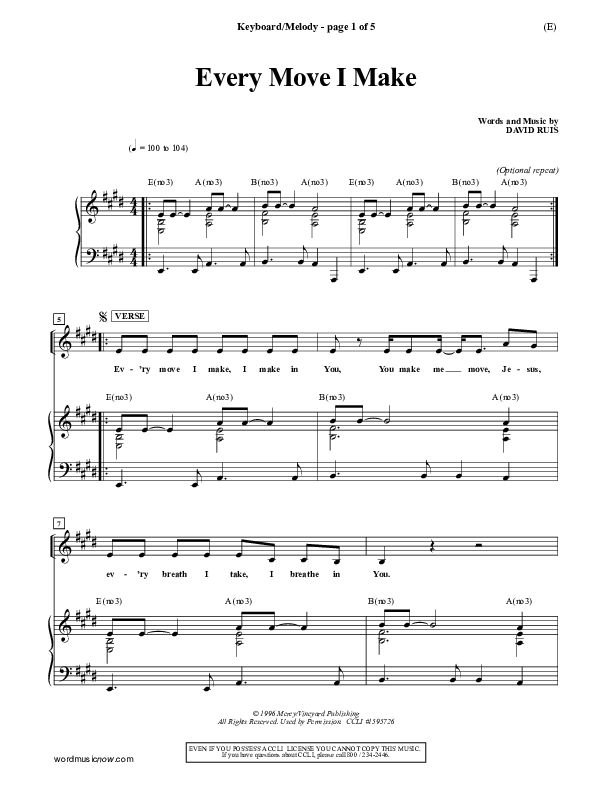 Download the piano sheet for Every Move I Make by David Ruis, from the album Word Music Now. This song was arranged by Keith Christopher in the key of E, F.