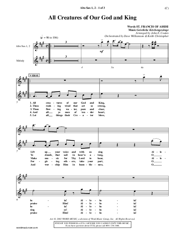 Download the Alto Sax 1,2 sheet music for All Creatures Of Our God And King by St. Francis of Assisi, from the album Word Music Now.