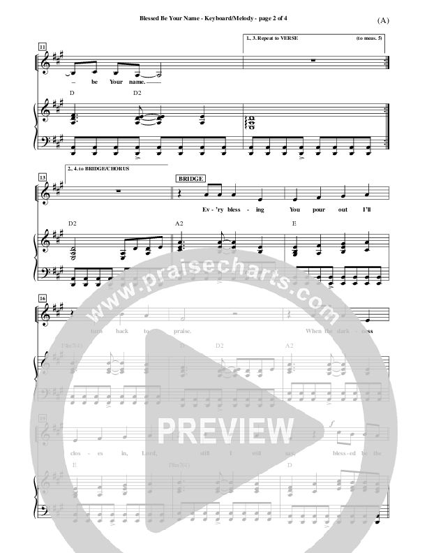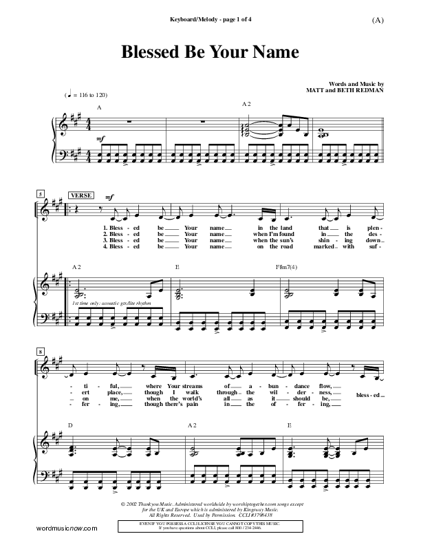 Download the sheet music for Blessed Be Your Name by Matt Redman, from the album Word Music Now. This song was arranged by Keith Christopher in the key of A, Bb.