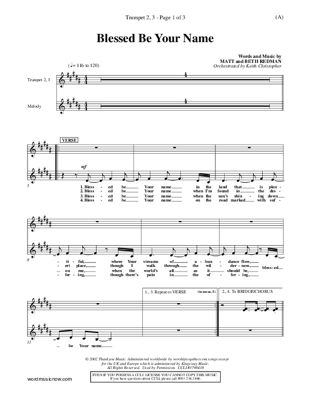 Download the Orchestration for Blessed Be Your Name by Matt Redman, from the album Word Music Now. This song was arranged by Keith Christopher in the key of A, Bb.