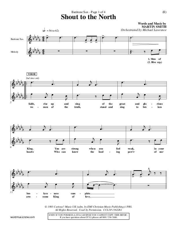 Download the Bari Sax sheet music for Shout To The North by Delirious, from the album Word Music Now. This song was arranged by Michael Lawrence in the key of E, F.