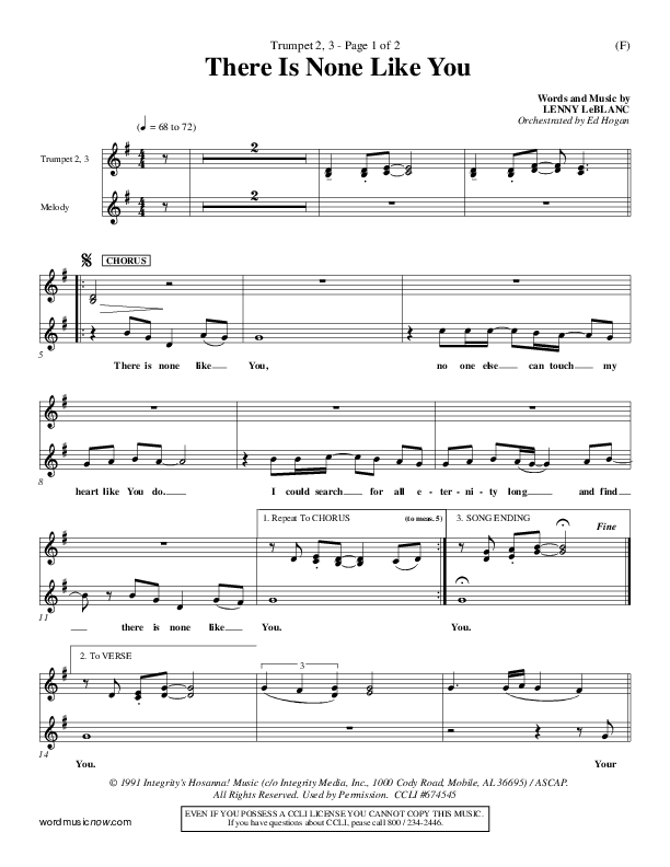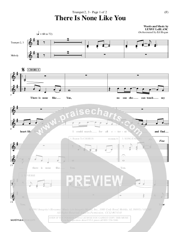 Download the Orchestration for There Is None Like You by Lenny LeBlanc, from the album Word Music Now. This song was arranged by Ed Hogan in the key of F, G.