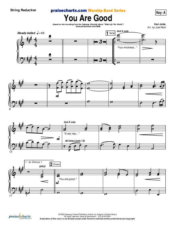Download the Orchestration string parts for You Are Good by Gateway Worship, from the album Wake Up The World. This song was arranged by Daniel Galbraith in the key of A, Bb.