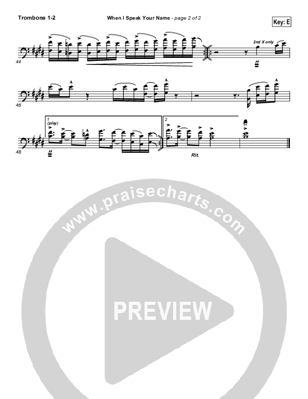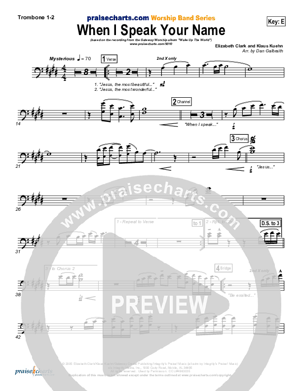 Download the Trombone 1,2 sheet music for When I Speak Your Name by Gateway Worship, from the album Wake Up The World. This song was arranged by Daniel Galbraith in the key of E, F.