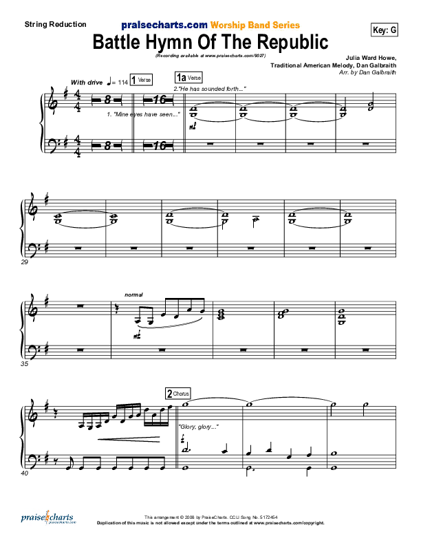 Download the Orchestration for Battle Hymn Of The Republic by PraiseCharts Band / Arr. Daniel Galbraith, from the album Patriotic PraiseHymns. This song was arranged by Daniel Galbraith in the key of Ab, G.