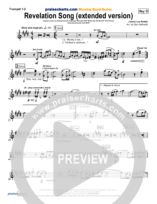 Download the trumpet sheet music for Revelation Song (Extended Version) by Gateway Worship, from the album Wake Up The World. This song was arranged by Daniel Galbraith in the key of D, Eb.