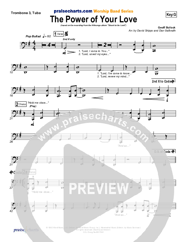 Download the Trombone 3/Tuba sheet music for The Power Of Your Love by Hillsong Worship, from the album Shout To The Lord. This song was arranged by David Shipps / Daniel Galbraith in the key of Ab, G.