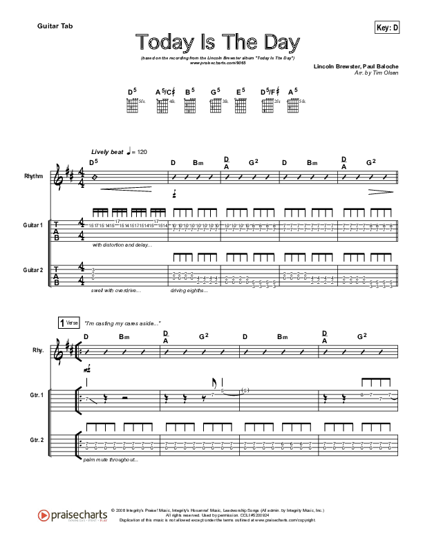 Download the Guitar Tab for Today Is The Day by Lincoln Brewster, from the album Today Is The Day. This song was arranged by Daniel Galbraith in the key of C, D.
