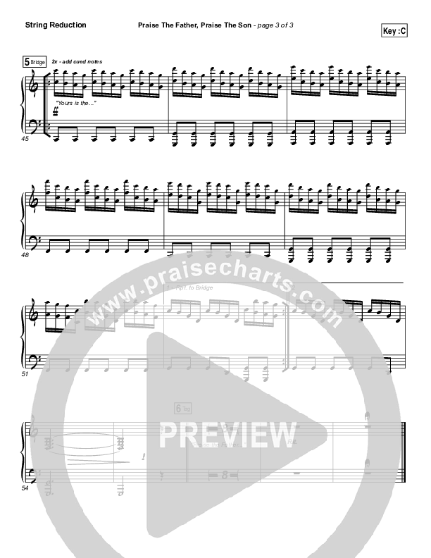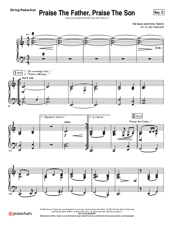 Download the Orchestration for Praise The Father Praise The Son by Chris Tomlin, from the album Hello Love. This song was arranged by Daniel Galbraith in the key of C, D, F.