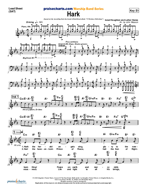 Download the sheet music for Hark by Israel Houghton, from the album A Timeless Christmas. This song was arranged by John Wasson in the key of C, Eb, F.