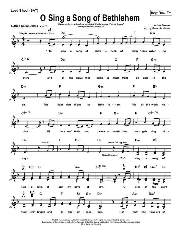 Download the sheet music for O Sing A Song Of Bethlehem, from the album Contemporary Worship Carols. This song was arranged by Brad Henderson in the key of Dm, Em.
