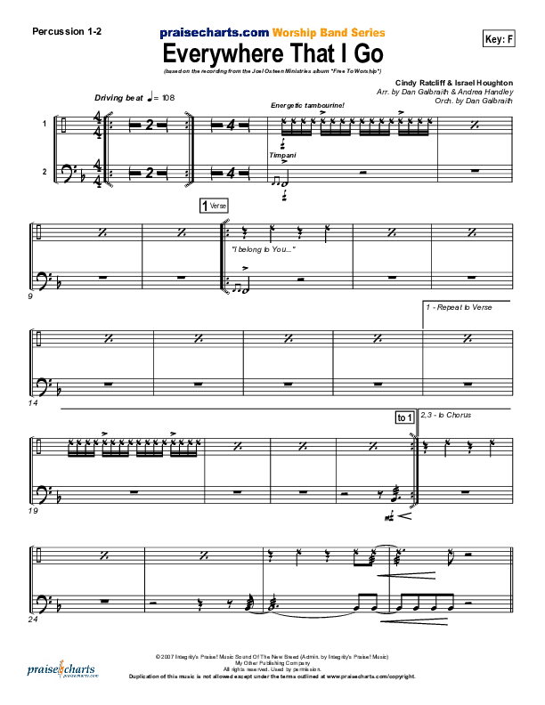 Download the Orchestration for Everywhere That I Go by Lakewood Church, from the album Free To Worship. This song was arranged by Daniel Galbraith / Andrea Handley in the key of F, G.
