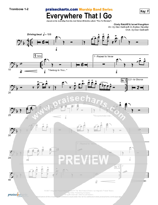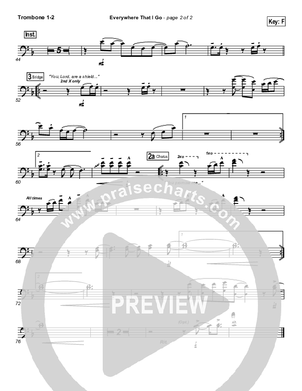 Download the Trombone 1,2 sheet music for Everywhere That I Go by Lakewood Church, from the album Free To Worship. This song was arranged by Daniel Galbraith / Andrea Handley in the key of F, G.