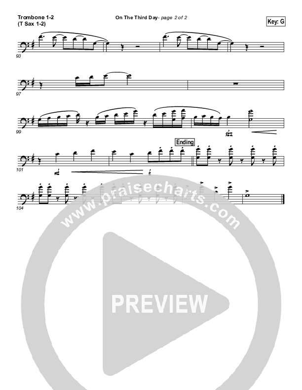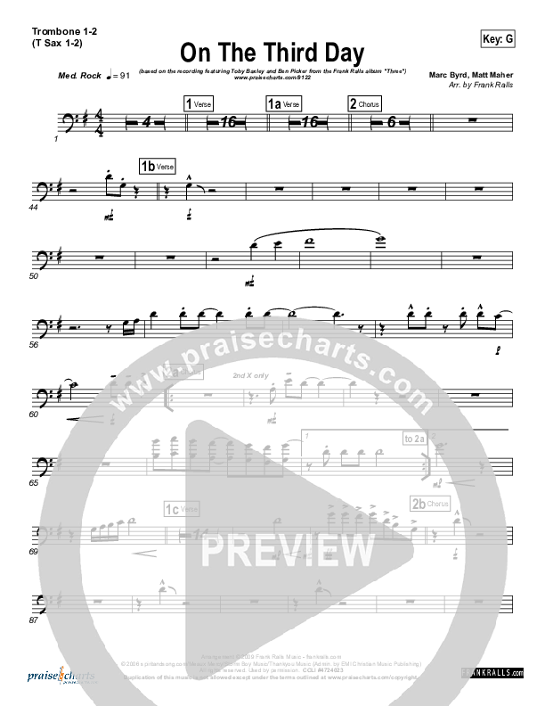 Download the Trombone 1,2 sheet music for On The Third Day by Frank Ralls / Toby Baxley / Ben Picker, from the album On The Third Day (Single). This song was arranged by Frank Ralls in the key of G, Gb.