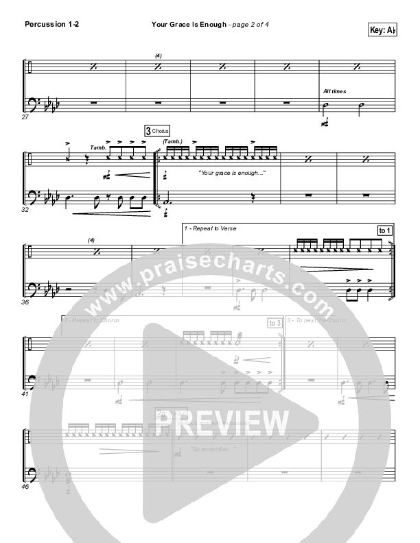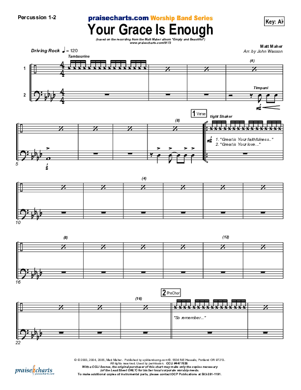 Download the percussion sheet music for Your Grace Is Enough by Matt Maher, from the album Empty And Beautiful. This song was arranged by John Wasson in the key of Ab, F, G.