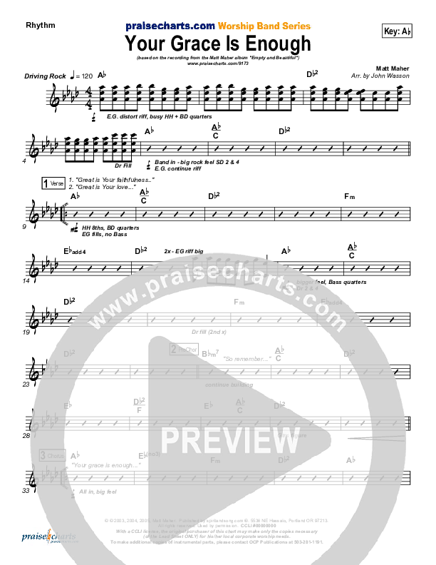 Download the Rhythm Chart for Your Grace Is Enough by Matt Maher, from the album Empty And Beautiful. This song was arranged by John Wasson in the key of Ab, F, G.