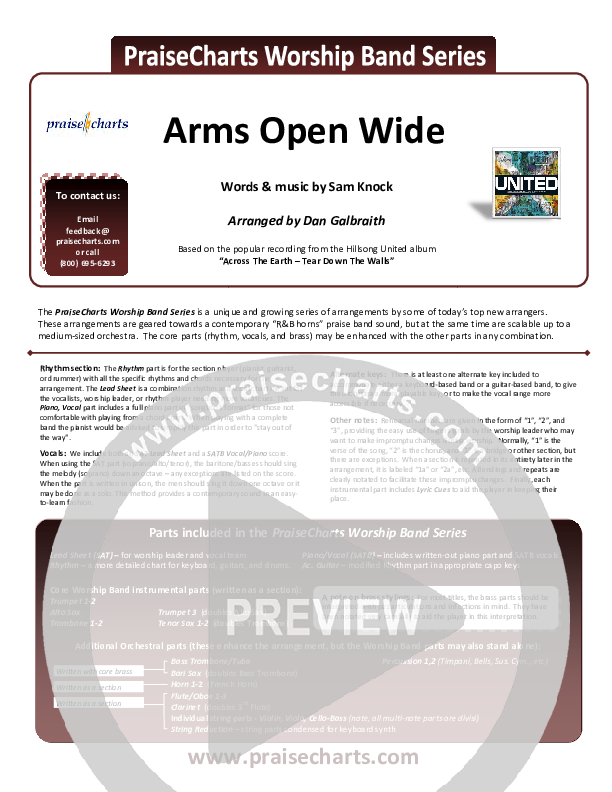 Download the Orchestration for Arms Open Wide by Hillsong UNITED, from the album Across The Earth: Tear Down The Walls. This song was arranged by Daniel Galbraith in the key of C, D.