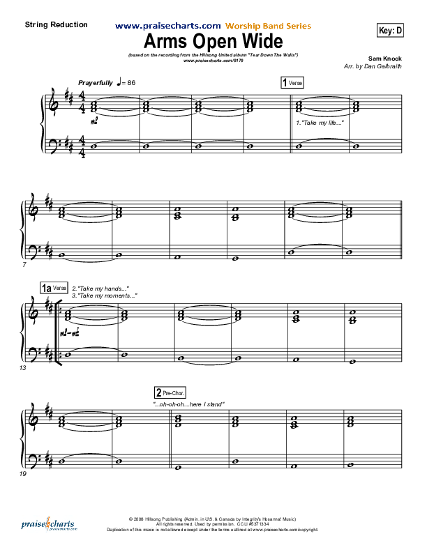 Download the Orchestration for Arms Open Wide by Hillsong UNITED, from the album Across The Earth: Tear Down The Walls. This song was arranged by Daniel Galbraith in the key of C, D.