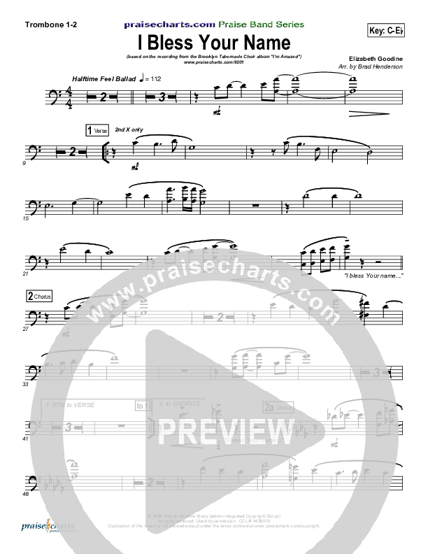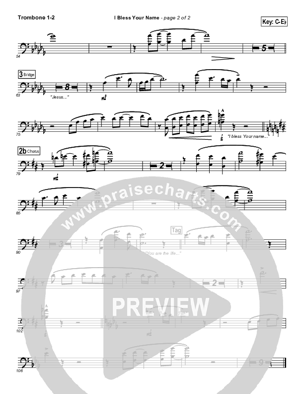Download the Trombone 1,2 sheet music for I Bless Your Name by Songs of Brooklyn Tabernacle Choir (PraiseCharts Edition), from the album Songs Of Brooklyn Tabernacle Choir. This song was arranged by Brad Henderson in the key of Bb, C.