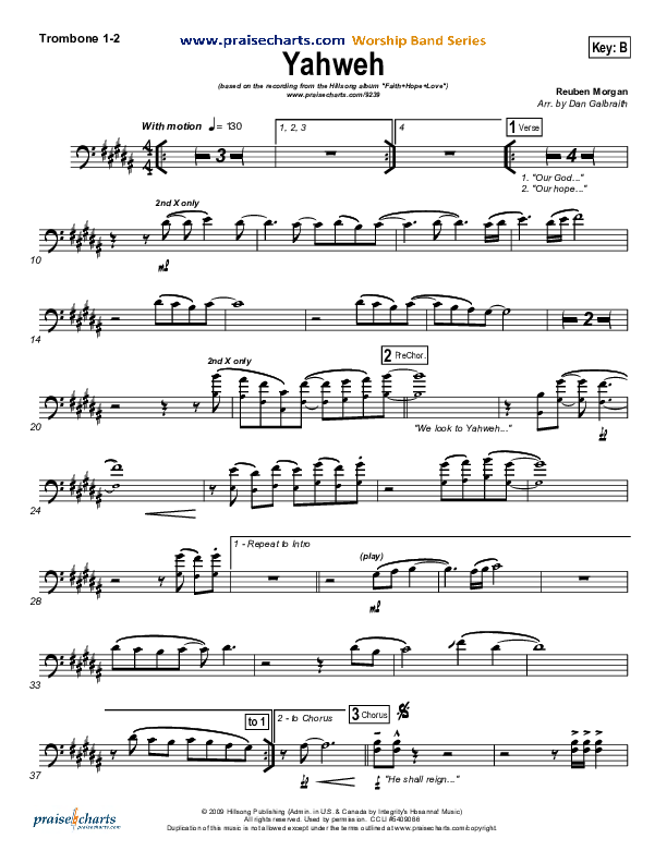 Download the Trombone 1,2 sheet music for Yahweh by Hillsong Worship, from the album Faith + Hope + Love. This song was arranged by Daniel Galbraith in the key of B, Bb.