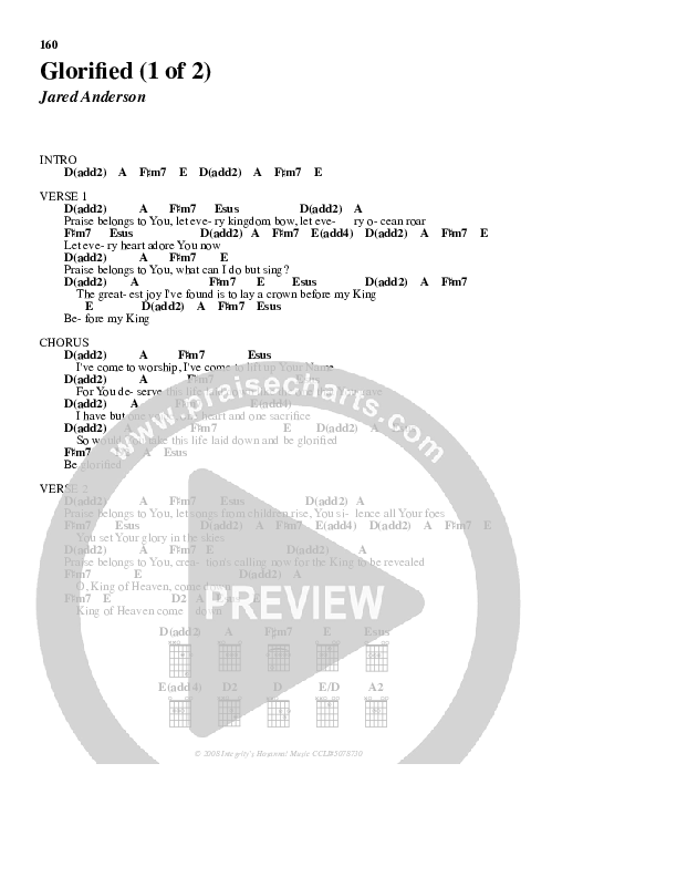 Download the PDF Chord Charts for Glorified by Jared Anderson, from the album Live From My Church. This song was arranged by Integrity Music in the key of A.