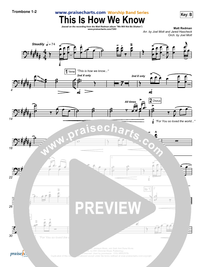 Download the Orchestration brass parts for This Is How We Know by Matt Redman, from the album We Shall Not Be Shaken. This song was arranged by Joel Mott / Jared Haschek in the key of B, Bb.