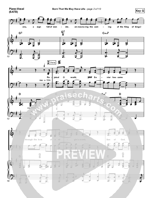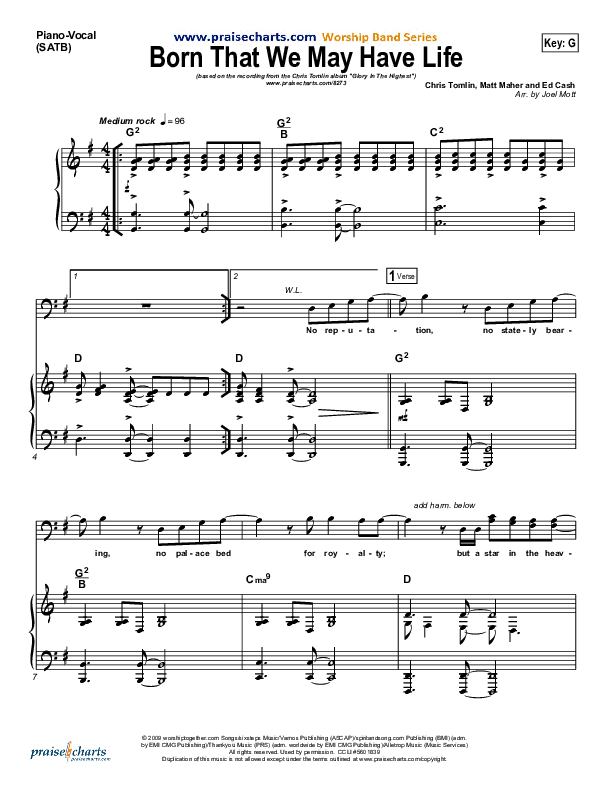 Download the sheet music for Born That We May Have Life by Chris Tomlin, from the album Glory In The Highest: Christmas Songs of Worship. This song was arranged by Joel Mott in the key of A, G.