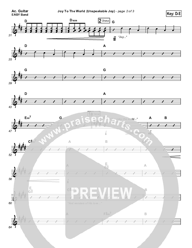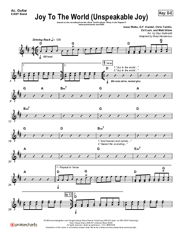 Download the Acoustic Guitar sheet music for Joy To The World (Unspeakable Joy) by Chris Tomlin, from the album Glory In The Highest: Christmas Songs of Worship. This song was arranged by Daniel Galbraith in the key of C, D.