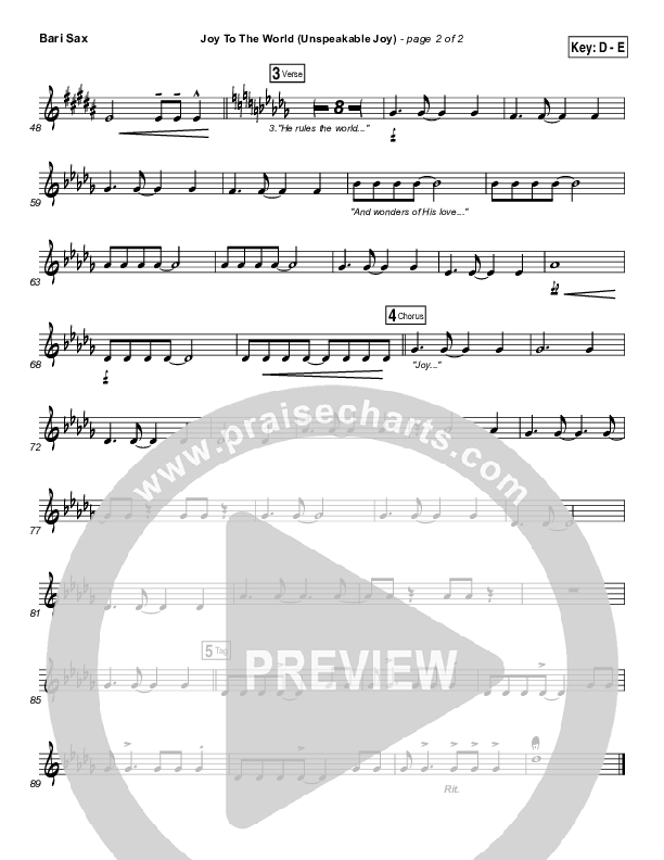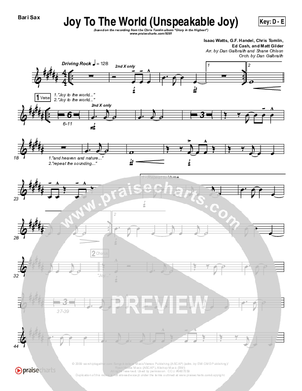 Download the Bari Sax sheet music for Joy To The World (Unspeakable Joy) by Chris Tomlin, from the album Glory In The Highest: Christmas Songs of Worship. This song was arranged by Daniel Galbraith in the key of C, D.