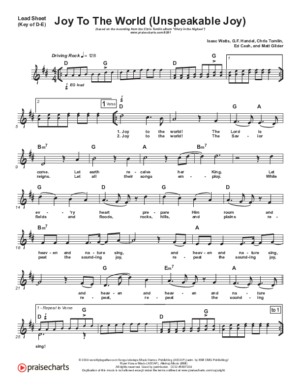Download the sheet music for Joy To The World (Unspeakable Joy) by Chris Tomlin, from the album Glory In The Highest: Christmas Songs of Worship. This song was arranged by Daniel Galbraith in the key of C, D.