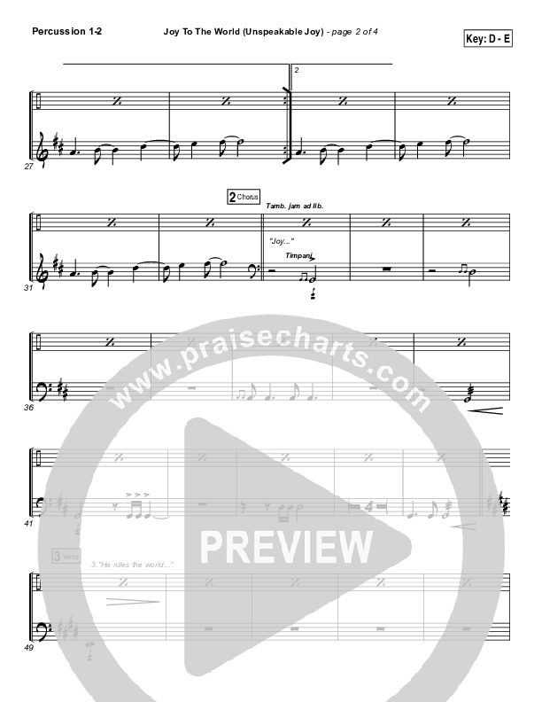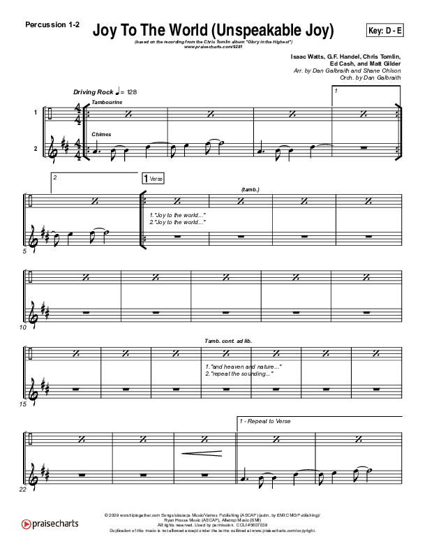 Download the percussion sheet music for Joy To The World (Unspeakable Joy) by Chris Tomlin, from the album Glory In The Highest: Christmas Songs of Worship. This song was arranged by Daniel Galbraith in the key of C, D.