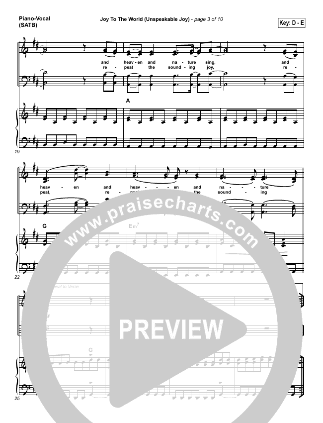Download the sheet music for Joy To The World (Unspeakable Joy) by Chris Tomlin, from the album Glory In The Highest: Christmas Songs of Worship. This song was arranged by Daniel Galbraith in the key of C, D.