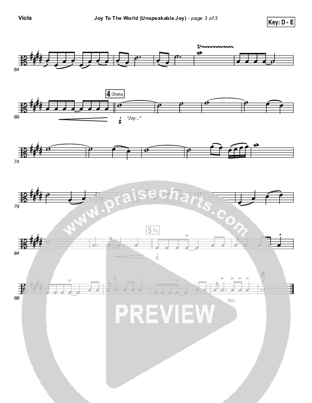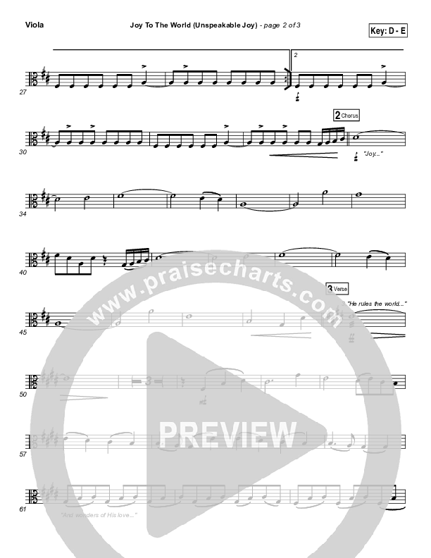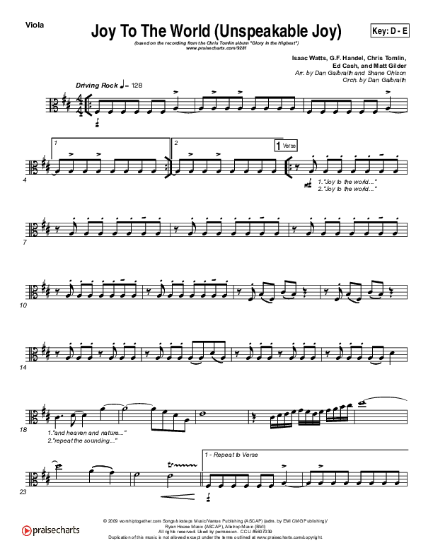 Download the Viola sheet music for Joy To The World (Unspeakable Joy) by Chris Tomlin, from the album Glory In The Highest: Christmas Songs of Worship. This song was arranged by Daniel Galbraith in the key of C, D.