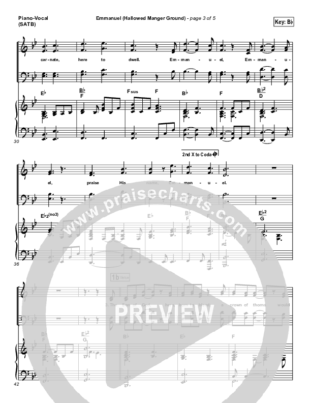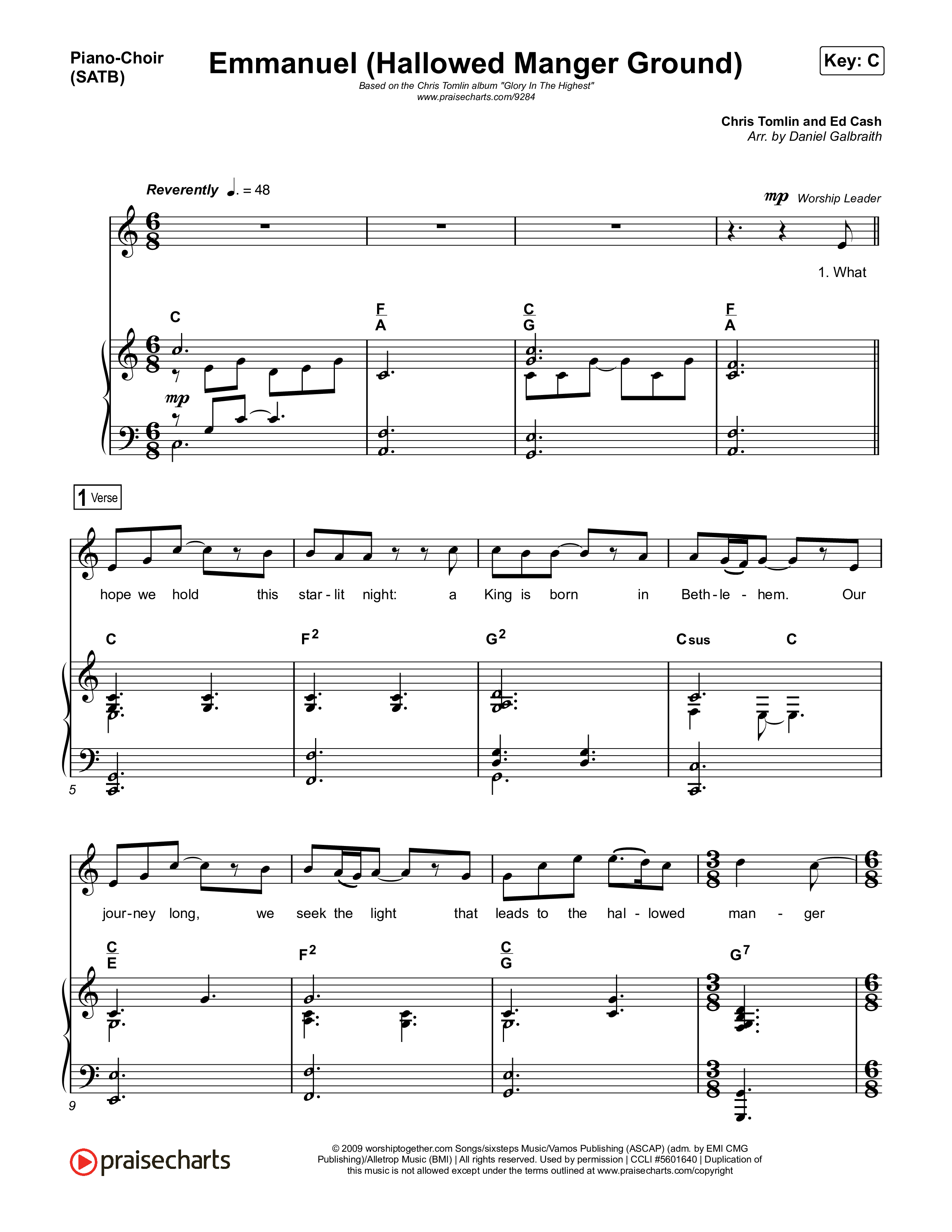 Download the sheet music for Emmanuel (Hallowed Manger Ground) by Chris Tomlin, from the album Glory In The Highest: Christmas Songs of Worship. This song was arranged by Daniel Galbraith in the key of A, Bb, C.