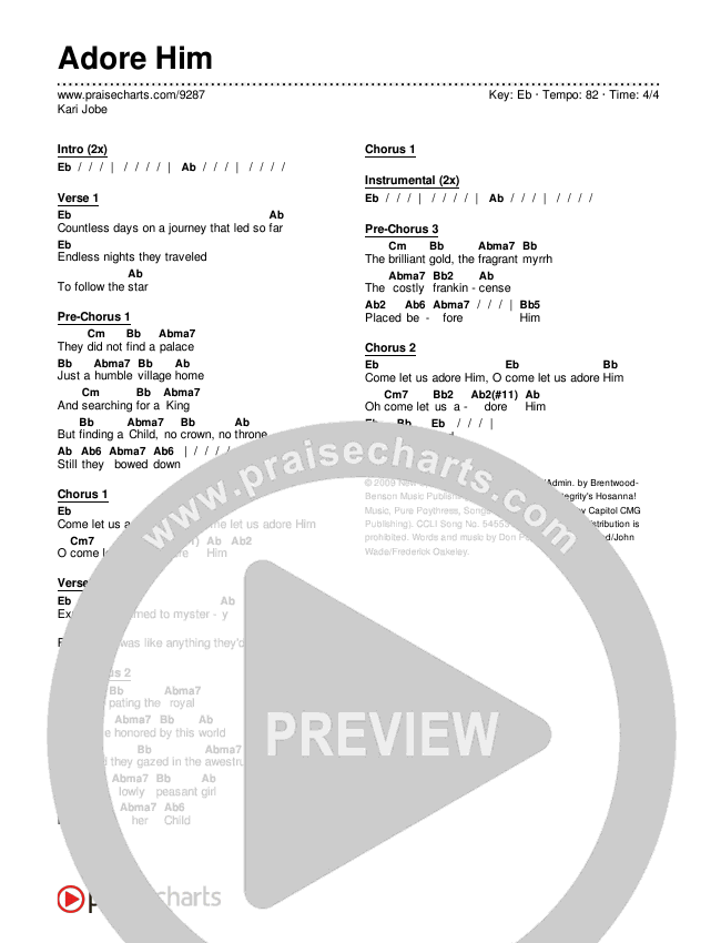Download the PDF Chord Charts for Adore Him by Kari Jobe, from the album Worship And Adore: A Christmas Offering. This song was arranged by John Wasson in the key of Eb, F.