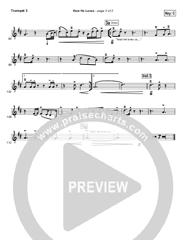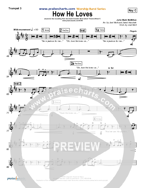 Download the Trumpet 3 sheet music for How He Loves by David Crowder, from the album Church Music. This song was arranged by Joel Mott / Jared Haschek in the key of Bb, C.