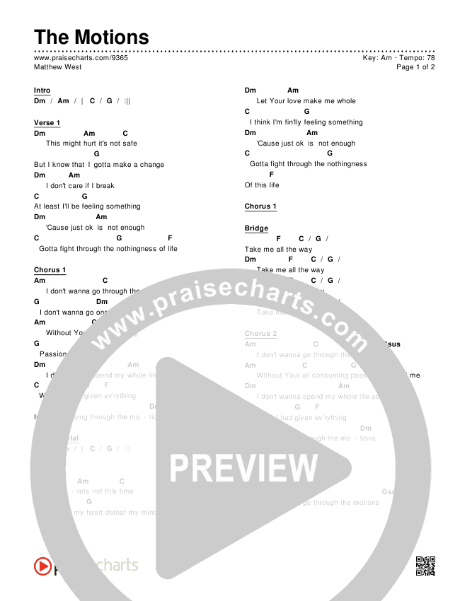 {t:The Motions} {su:www.praisecharts.com/9365} {k:Dm} {d_t:78} {d_ok:Dm} {f:©2006 Word Music, LLC, Songs For Lulu, Wyzell Music, Simplex Songs, Songs Of Extreme (a div. of Word Music Group, Inc.), (Admin. by Word Music Group, Inc.), (Admin. by Simpleville Music, Inc.). All rights reserved. CCLI song No. 4780335. By Jason Houser, Matthew West, Sam Mizell} {c:Intro} [Gm][/][Dm][/][|][F][/][C][/][:||] {c:Verse 1} [Gm] This might [Dm]hurt it's not [F]safe But I know that I [C]gotta make a change [Gm] I don't [Dm]care if I break [F]At least I'll be [C]feeling something [Gm] 'Cause just ok [Dm]is not enough [F] Gotta fight through the [C]nothingness of [Bb]life {soc} {c:Chorus 1} [Dm] I don't wanna go [F]through the motions [C] I don't wanna go [Gm]one more day [Dm] Without Your [F]all consuming [C] Passion inside of me [Gm] I don't wanna spend my [Dm]whole life asking [F] What if I had [C]given [Bb]ev'rything Instead of going through the mo - [Gm]tions {eoc} {c:Instrumental} [Gm][/][Dm][/][|][F][/][C][/][:||] {c:Verse 2} [Gm] No reg - [Dm]rets not this [F]time [F] Gonna let my [C]heart defeat my mind [Gm] Let Your [Dm]love make me whole [F] I think I'm fin'lly [C]feeling something [Gm] 'Cause just ok [Dm]is not enough [F] Gotta fight through the [C]nothingness Of this [Bb]life {soc} {c:Chorus 1} {eoc} {c:Bridge} Take me [Bb]all the [F]wa[/]y [C][/] [Gm] Take me [Bb]all the [F]wa[/]y [C][/] [Gm] Take me [Bb]all the [F]wa[/]y [C][/] [Gm] Take me [Bb]all the [F]wa[/]y [C][/] {soc} {c:Chorus 2} [Dm] I don't wanna go [F]through the motions [Csus] [Dm] Without Your [F]all consuming [C]passion inside of me [Gm] I don't wanna spend my [Dm]whole life asking [F] What if I had [C]given [Bb]ev'rything Instead of going through the mo - [Gm]tions {eoc} {c:Bridge} {c:Ending} [Dm] I don't wanna go through the motions [Csus] {define: Gm base-fret 1 frets 3 1 0 0 3 3} {define: Dm base-fret 1 frets x x 0 2 1 3} {define: F base-fret 1 frets 1 3 3 2 1 1} {define: C base-fret 1 frets x 3 2 0 1 0} {define: A# base-fret 1 frets x 1 3 3 3 1} {define: Csus base-fret 1 frets x 3 3 0 1 1}...