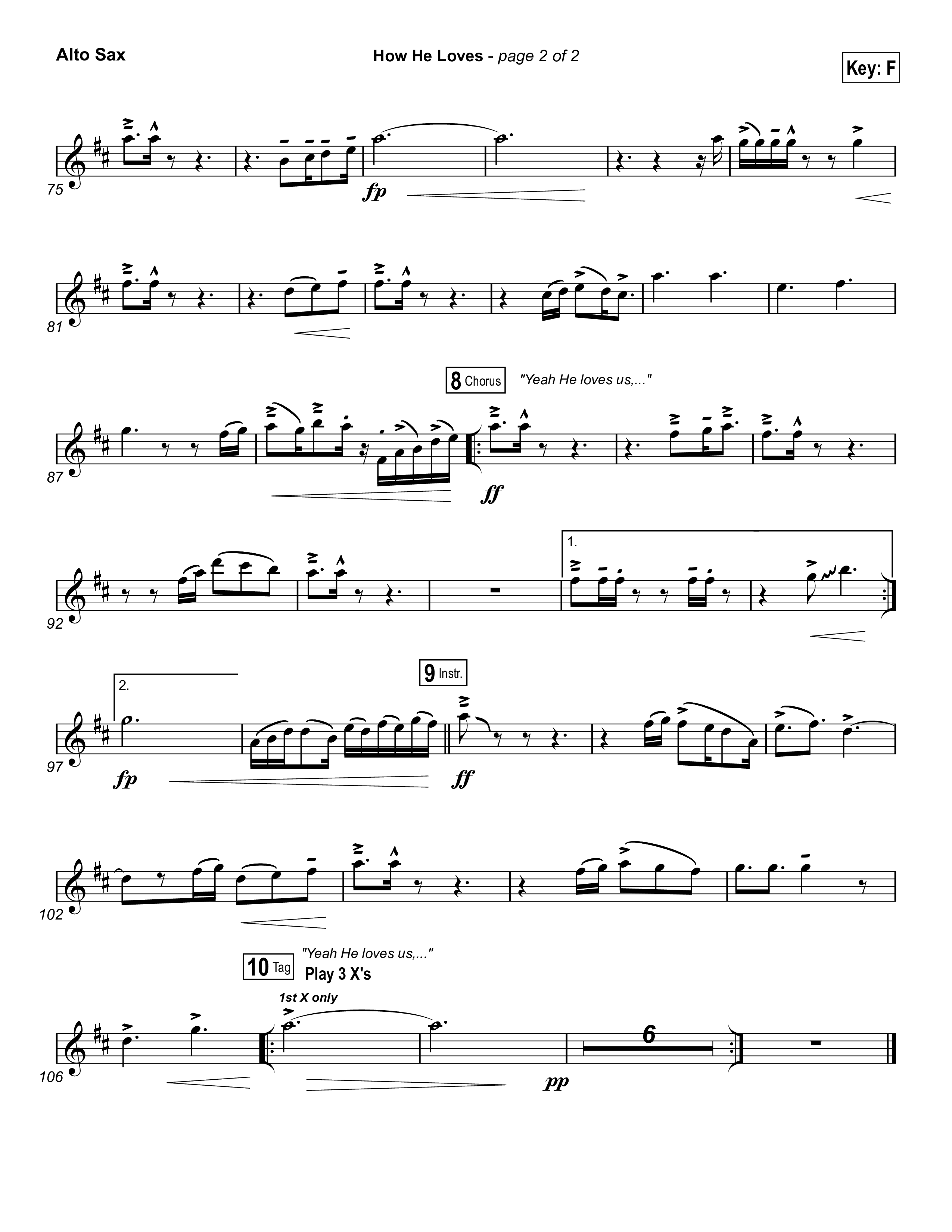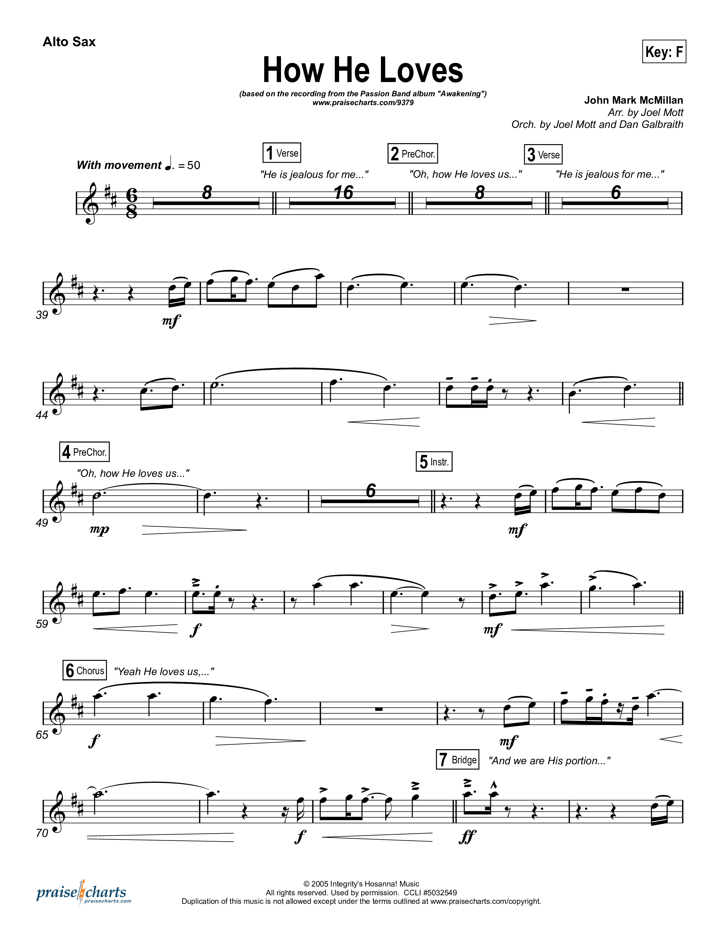 Download the Alto Sax 1,2 sheet music for How He Loves by David Crowder / Passion, from the album Passion: Awakening. This song was arranged by Joel Mott / Daniel Galbraith in the key of Bb, C, F.