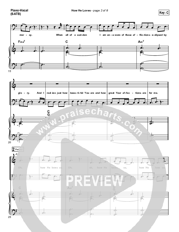 Download the sheet music for How He Loves by David Crowder / Passion, from the album Passion: Awakening. This song was arranged by Joel Mott / Daniel Galbraith in the key of Bb, C, F.