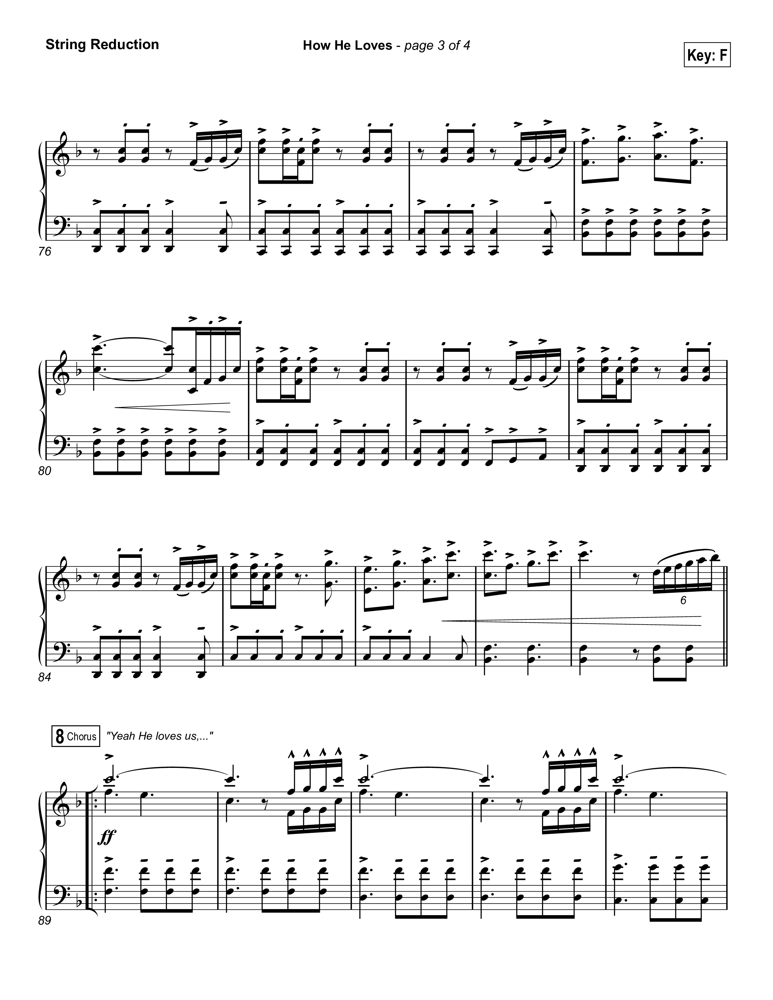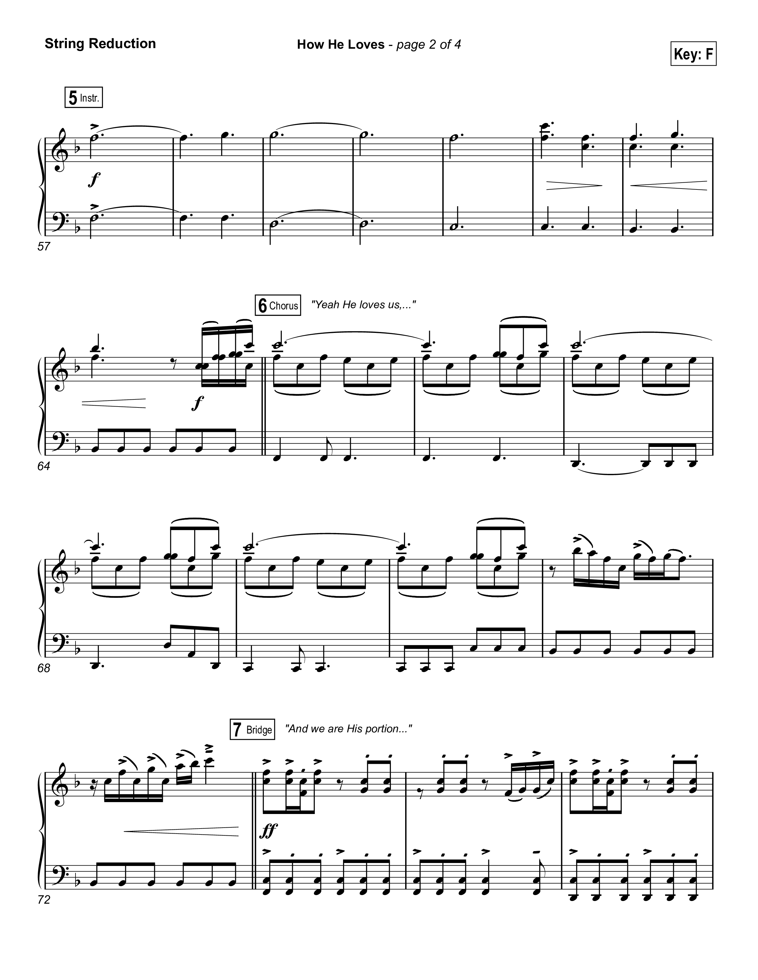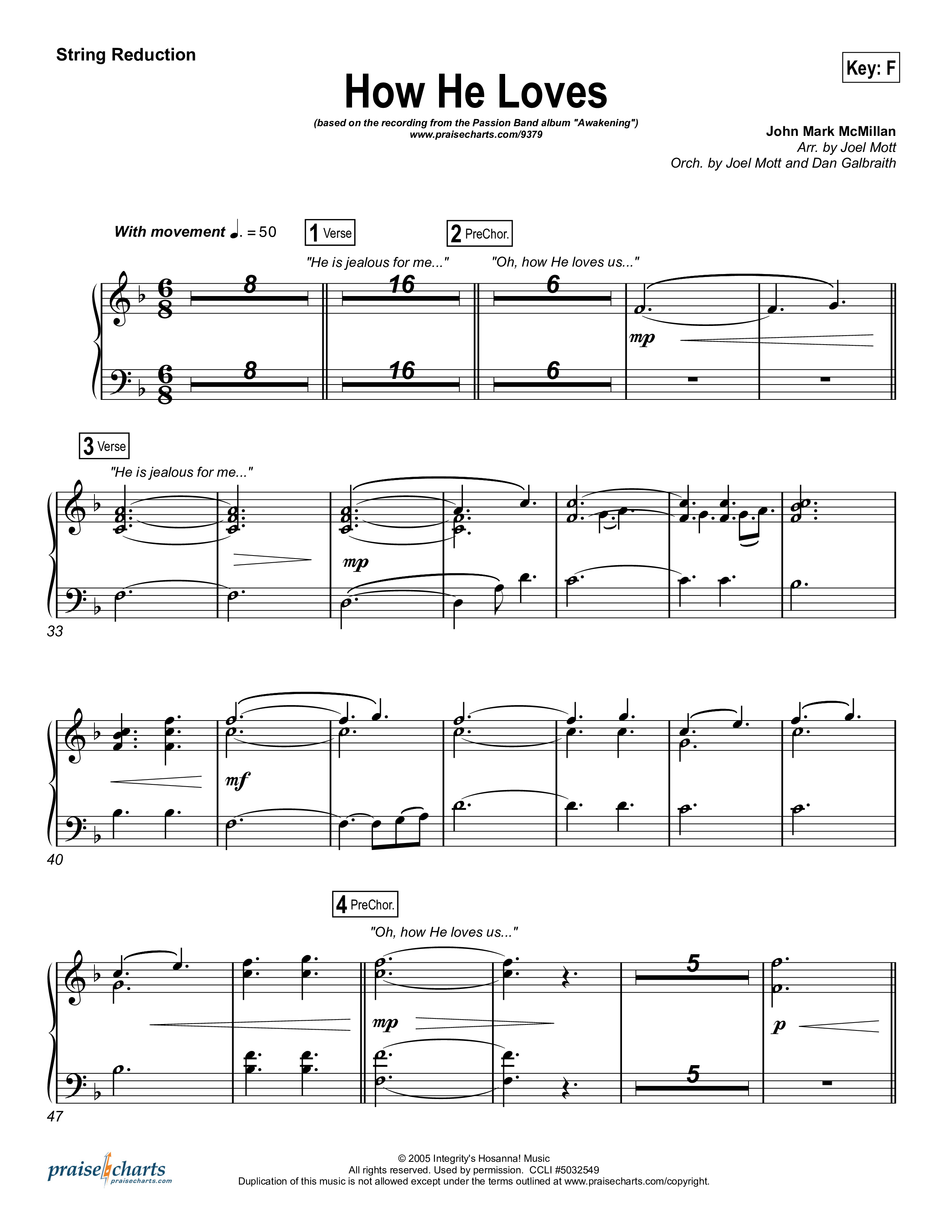 Download the String Reduction sheet music for How He Loves by David Crowder / Passion, from the album Passion: Awakening. This song was arranged by Joel Mott / Daniel Galbraith in the key of Bb, C, F.