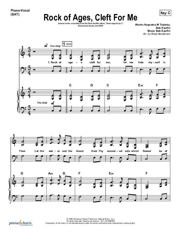 Download the sheet music for Rock Of Ages Cleft For Me by Bob Kauflin, from the album Upward. This song was arranged by Brad Henderson in the key of C, D.