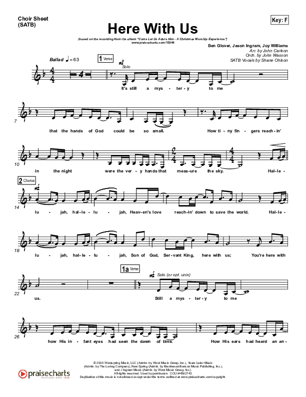Download the Choir Sheet for Here With Us by Joy Williams, from the album Come Let Us Adore Him: A Christmas Worship Experience. This song was arranged by John Carlson / John Wasson in the key of D, E, Eb, F, G.