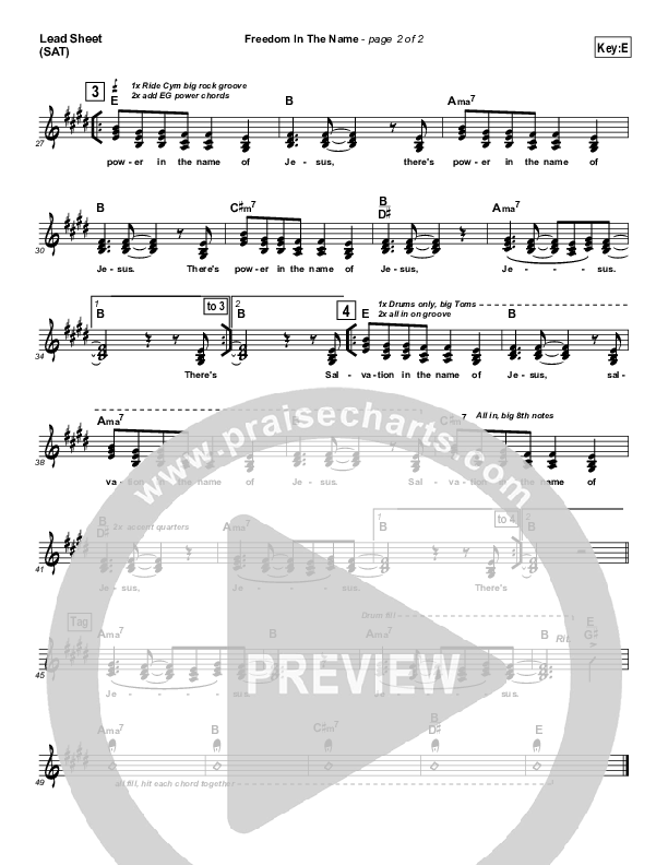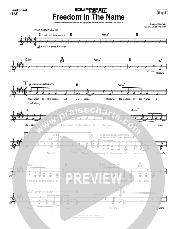 Download the sheet music for Freedom In The Name by Equippers Church, from the album We Won't Be Silent. This song was arranged by John Wasson in the key of E, F.