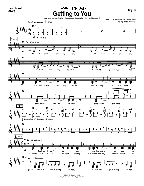 Download the sheet music for Getting To You by Equippers Church, from the album We Won't Be Silent. This song was arranged by John Wasson in the key of B, C.